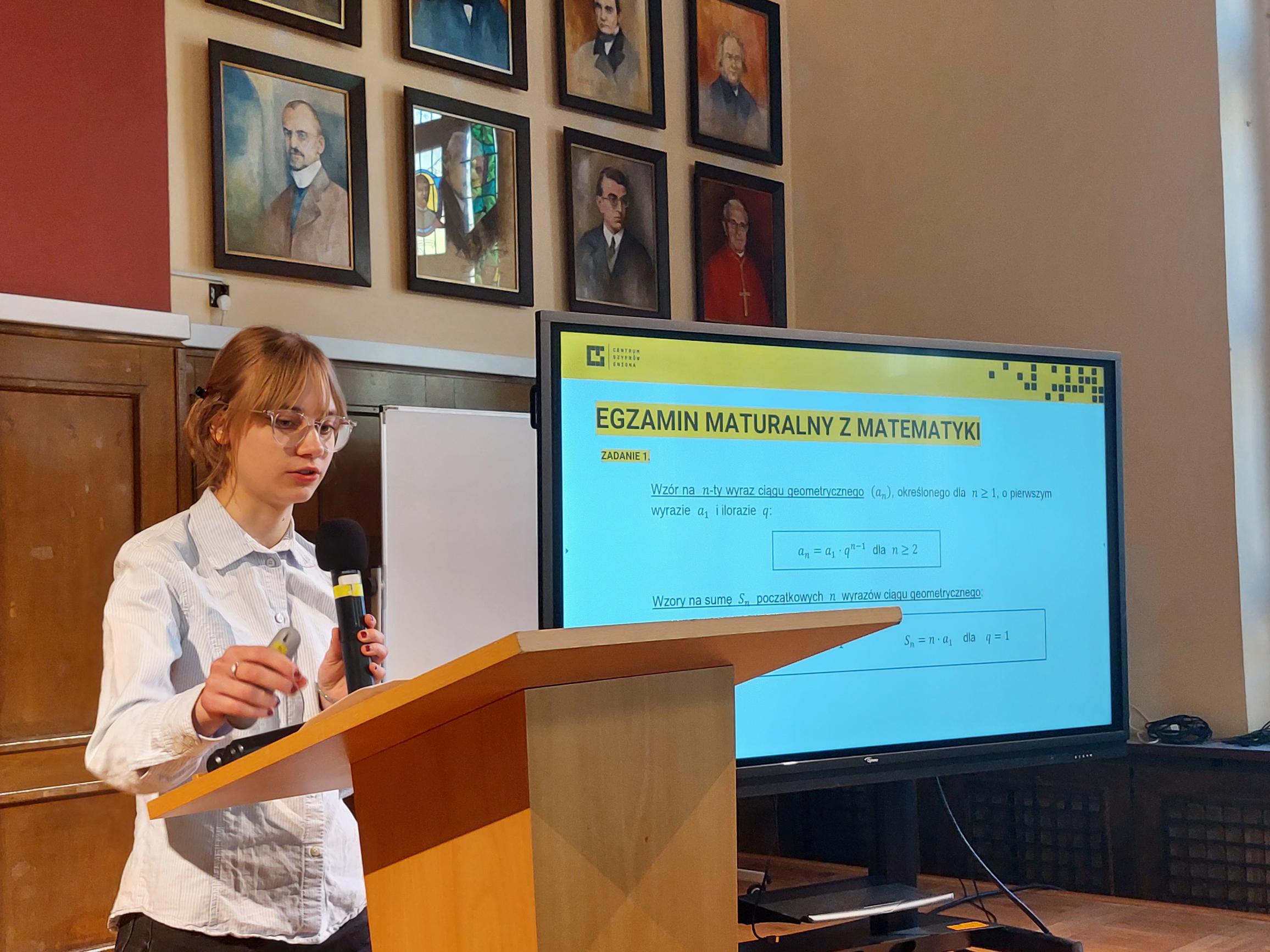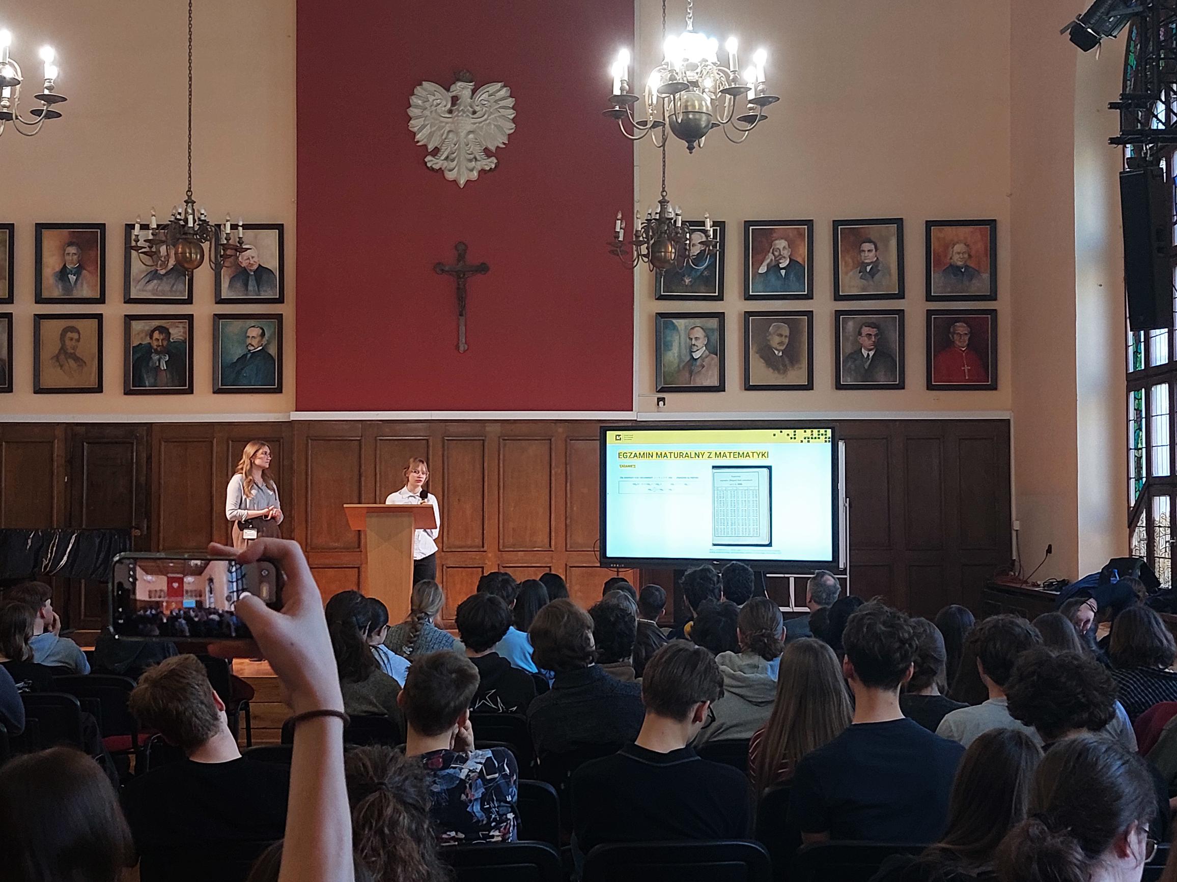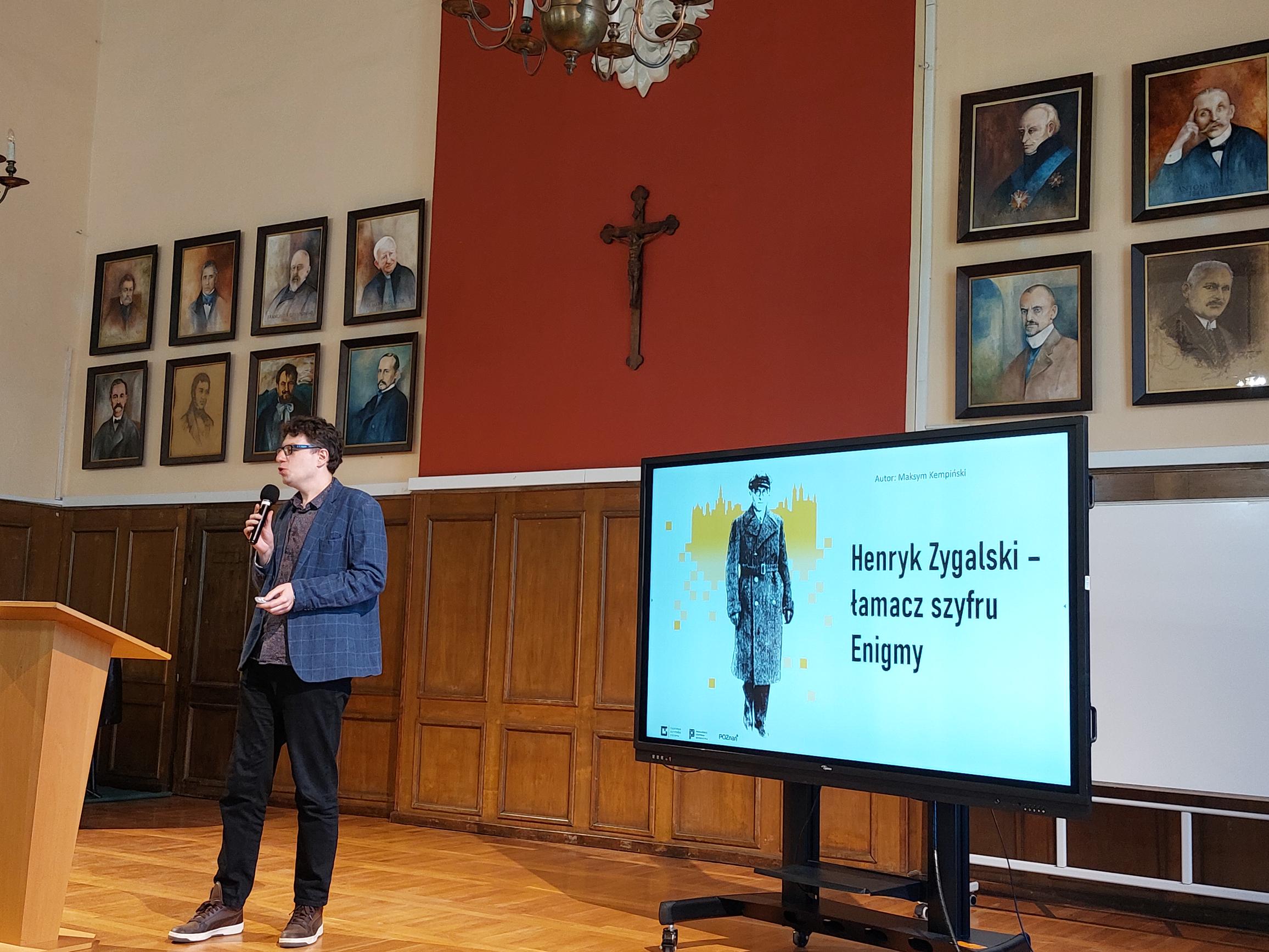 Nie zabrakło warsztatów kryptologicznych – uczennice i uczniowie mogli samodzielnie poznać techniki szyfrowania informacji sprzed wieków, a później je złamać. Później w auli odbyły się prelekcje nie tylko pokazujące edukację Poznaniaka, jednego z łamaczy szyfru Enigmy, ale także jego dalsze losy i wkład w łamanie niemieckiego szyfru. Prześledziliśmy, w jaki sposób młody Henryk rozwiązał maturalne zadania i… w czym popełnił drobny błąd obliczeniowy.