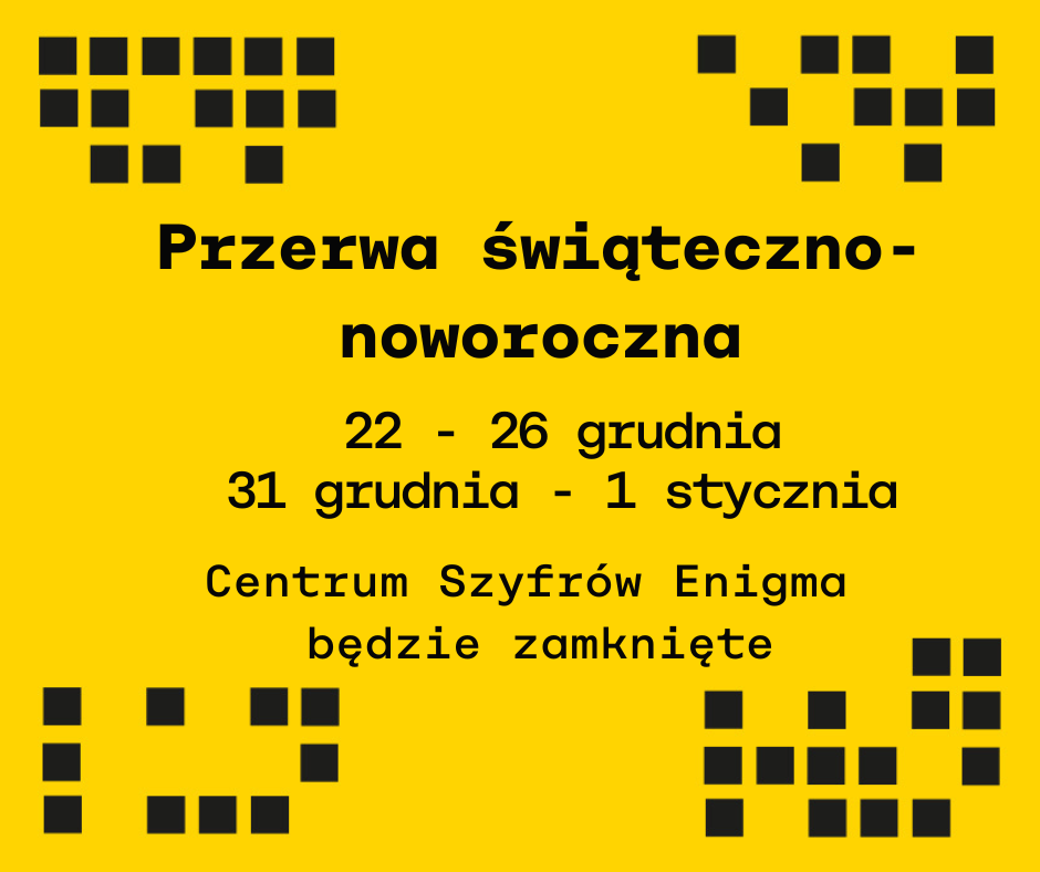 Informujemy, że w dniach 𝐨𝐝 𝟐𝟐 𝐝𝐨 𝟐𝟔 𝐠𝐫𝐮𝐝𝐧𝐢𝐚 oraz 𝐨𝐝 𝟑𝟏 𝐠𝐫𝐮𝐝𝐧𝐢𝐚 𝐝𝐨 𝟏 𝐬𝐭𝐲𝐜𝐳𝐧𝐢𝐚 Centrum Szyfrów ENIGMA będzie zamknięte.