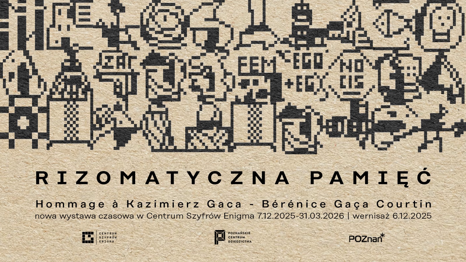 Wystawa „Rizomatyczna Pamięć – Hommage à Kazimierz Gaca” artystki Bérénice Gaça Courtin w Centrum Szyfrów Enigma to wyjątkowe spotkanie współczesnej sztuki z historią polskich kryptologów oraz z osobistą pamięcią rodzinną. Artystka — wnuczka Kazimierza Gacy, najmłodszego członka zespołu, który łamał szyfry Enigmy — tworzy wielkoformatowe tkaniny i intymne miniatury-kody, w których zapisuje własny alfabet pamięci. Jej nitroglify, współczesne hieroglify utkane nicią na cyfrowym krośnie, splatają wątki wojennej biografii, mitologii i rodzinnych historii.